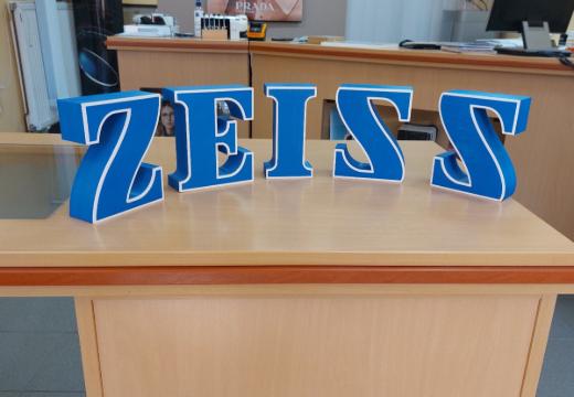 Die freistehenden Buchstaben der Marke Zeiss mit ihren Konturen und dem zweifarbigen Druck sehen im Schaufenster von Szendi Optik in Kőszeg fantastisch aus. Die Buchstaben bestehen aus robustem, UV-beständigem ASA-Material und können sogar vor Türen angebracht werden.