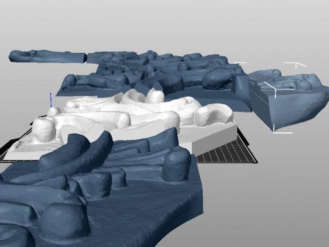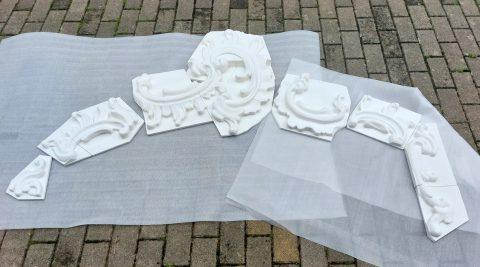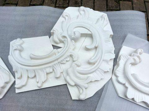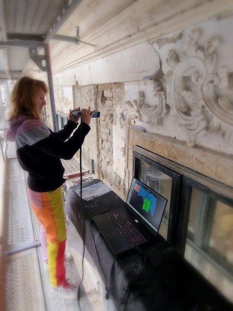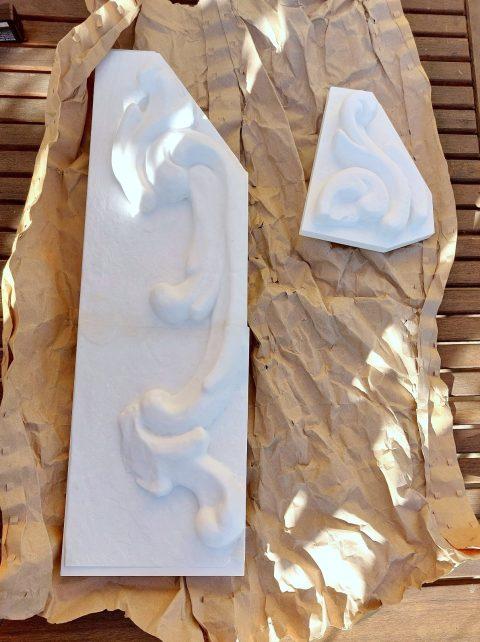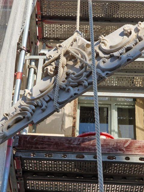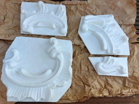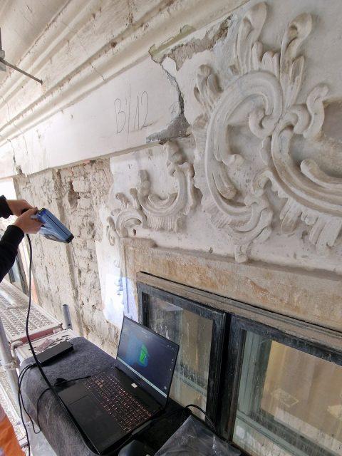 A szkennelt forma szoftveres javítás és utómunka után nyomtatásra került. Egy-egy részlet elkészítése 1-3 teljes napot vett igénybe. Ezután az épületszobrász vette kezelésbe: a hiányzó részek pótlása, a felület javítása, simítása, az illesztések hézagolása következett. A rengeteg kézi munka után gyakran nem egy, hanem két lépcsőben veszik le a mintát, amelynek segítségével az új díszítő-elem végül elkészülhet. Ez az épület több épületszobrász mester többhavi munkája nyomán szépülhetett meg. A hely titkos, de aki felismeri, annak pirospont jár 😊