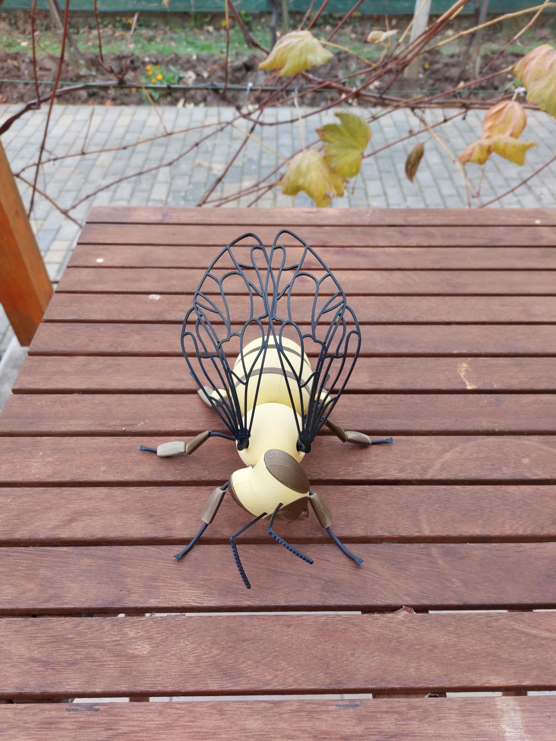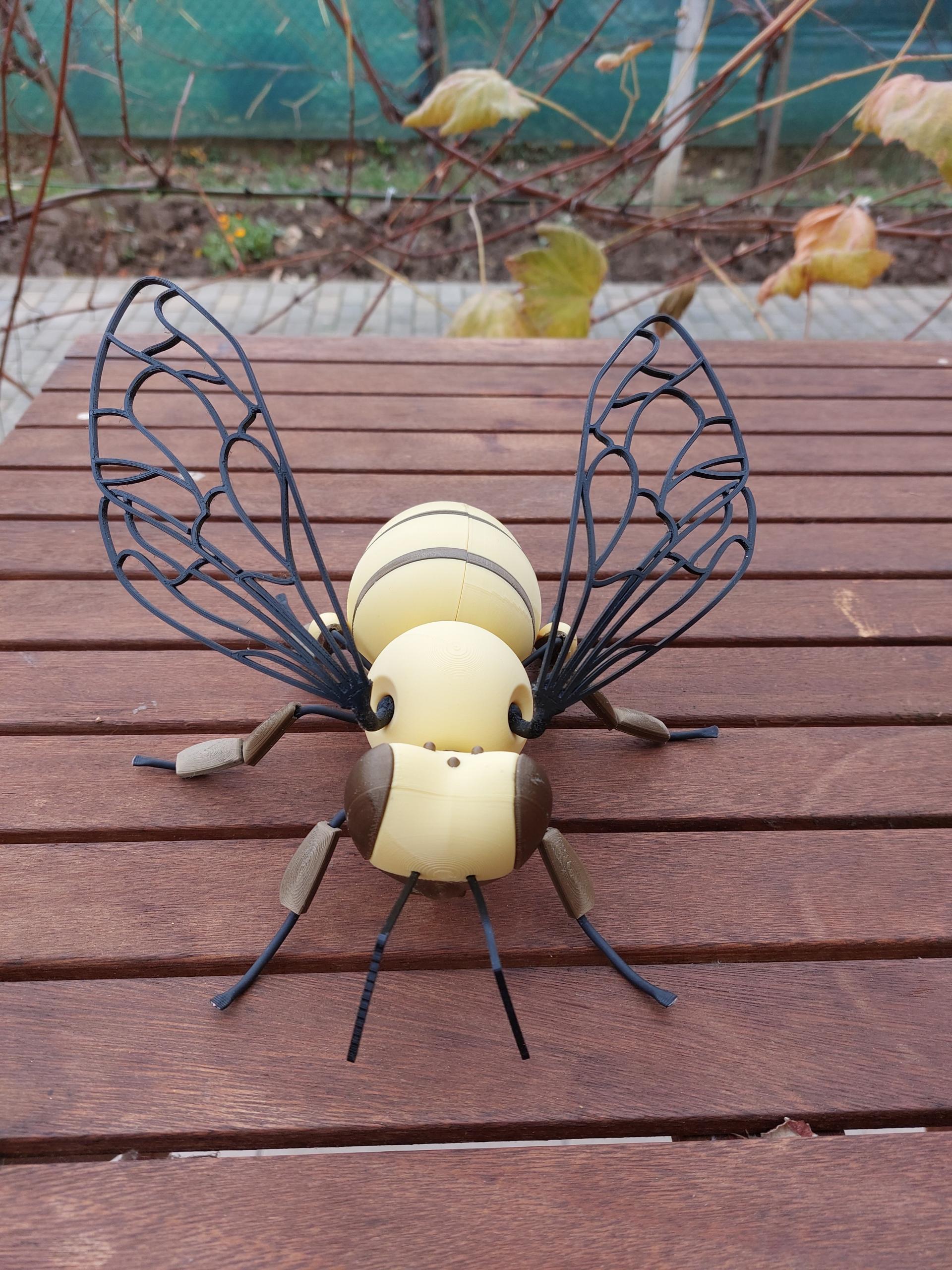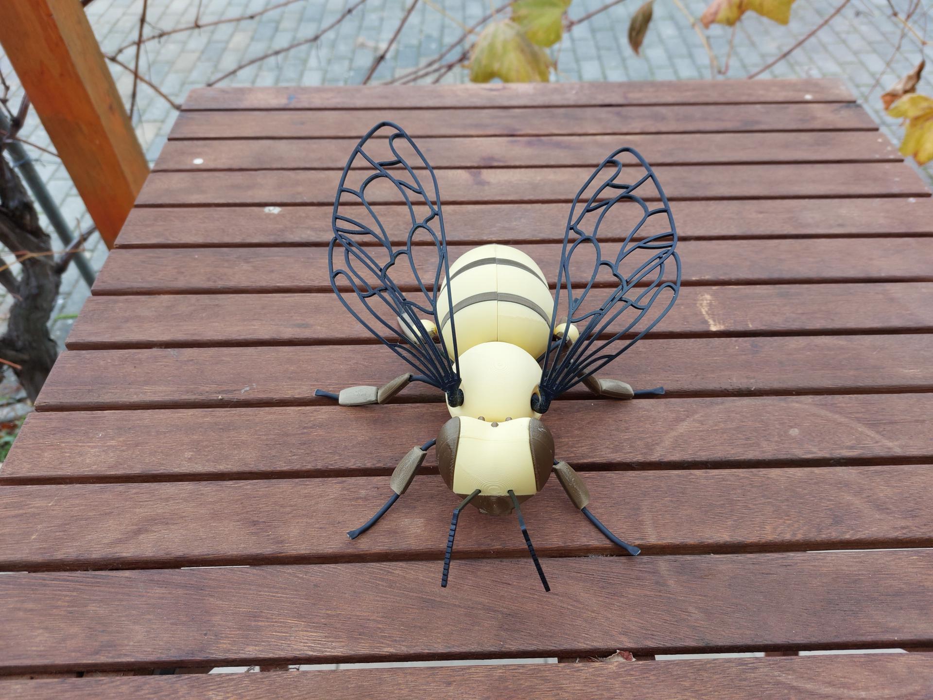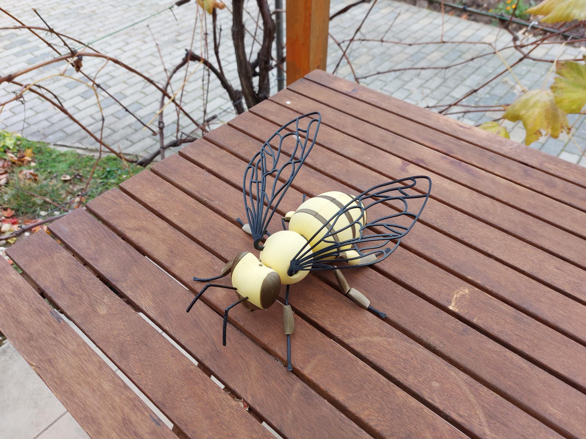 Anyagok: PLA (fej, tor, potroh, kosárka, ízek a lábakon) + TPU (szárnyak, csápok) + saválló drót zsugorcsővel és PLA elemekkel (lábak)