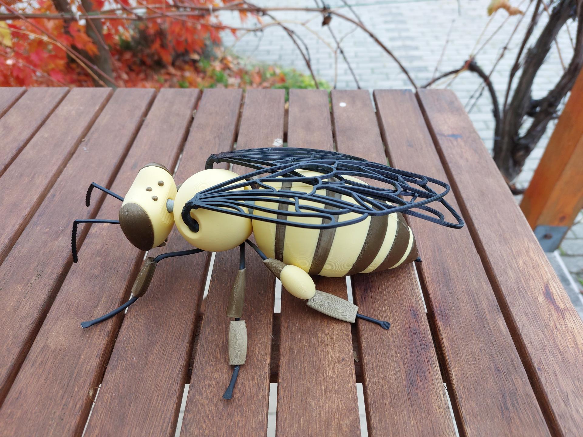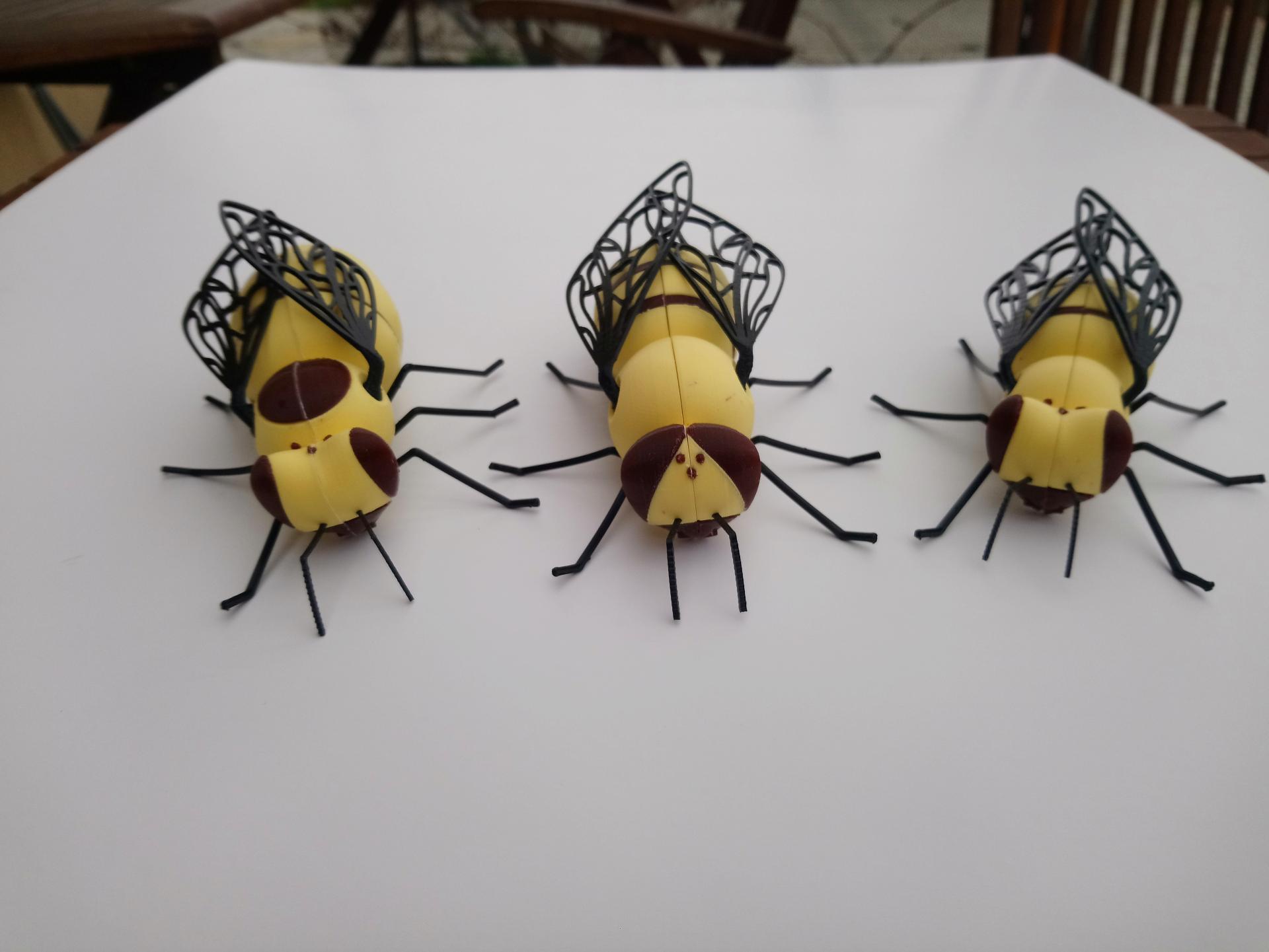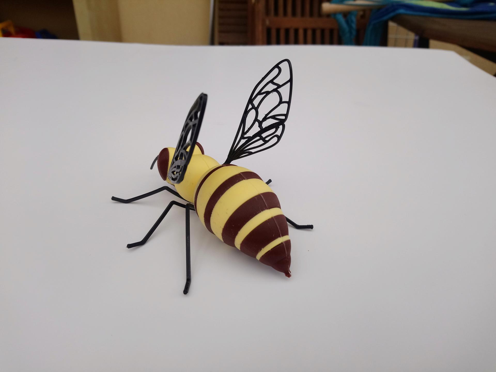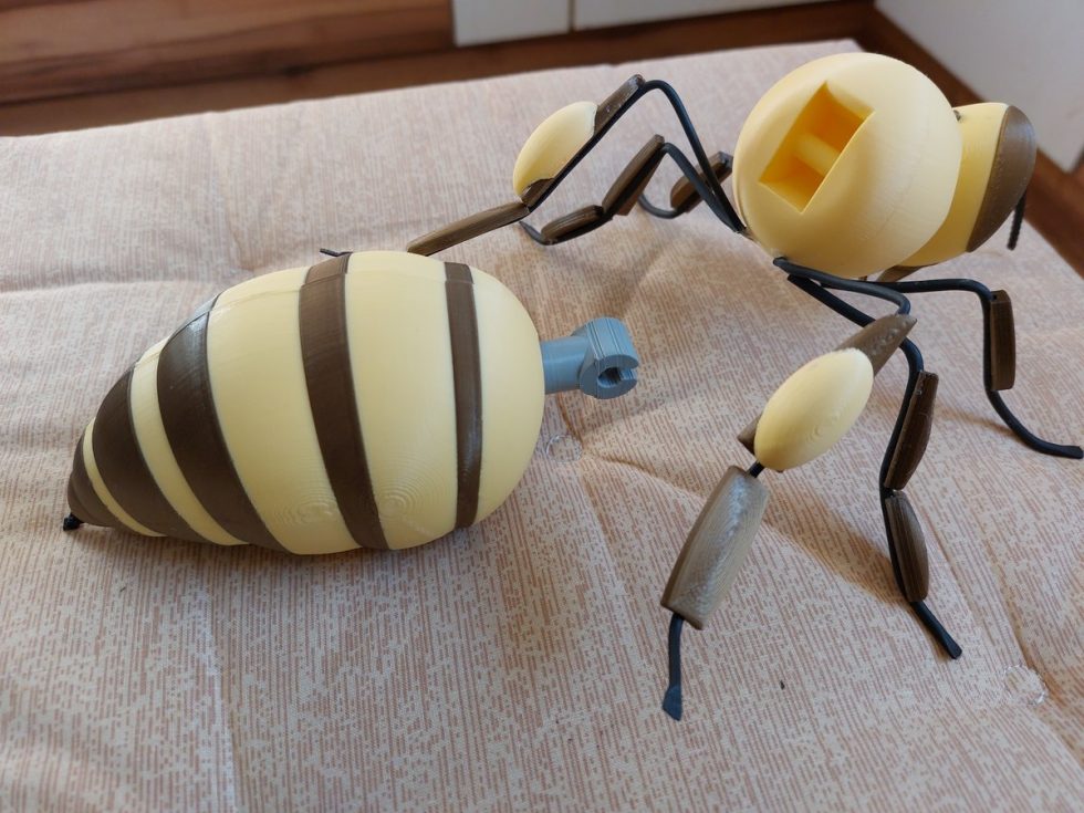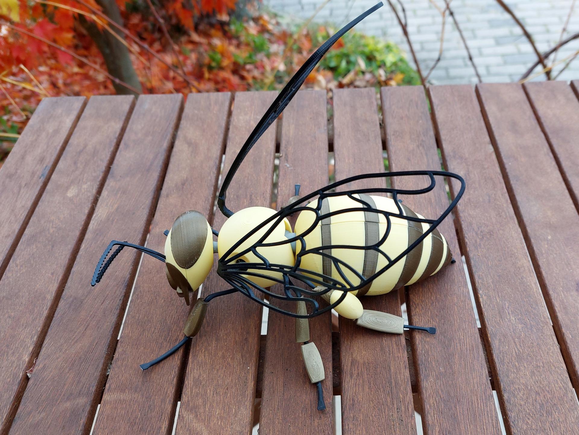 Anyagok: PLA (fej, tor, potroh, kosárka, ízek a lábakon) + TPU (szárnyak, csápok) + saválló drót zsugorcsővel és PLA elemekkel (lábak)