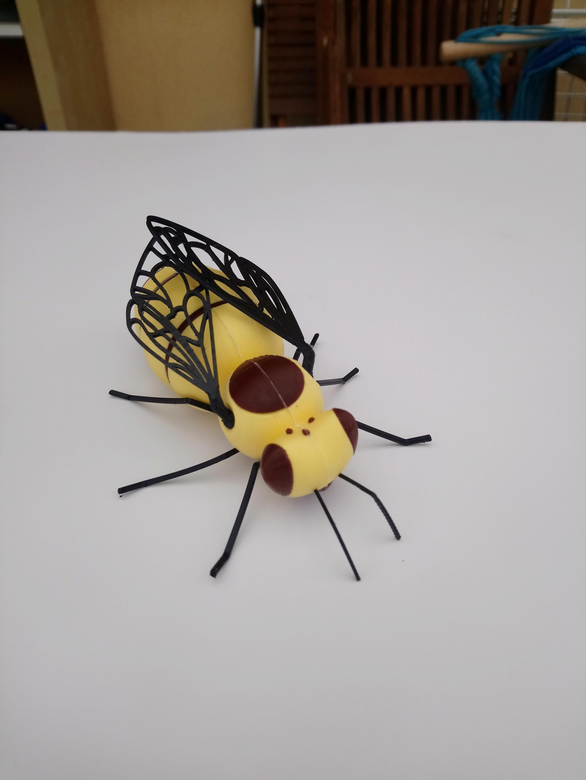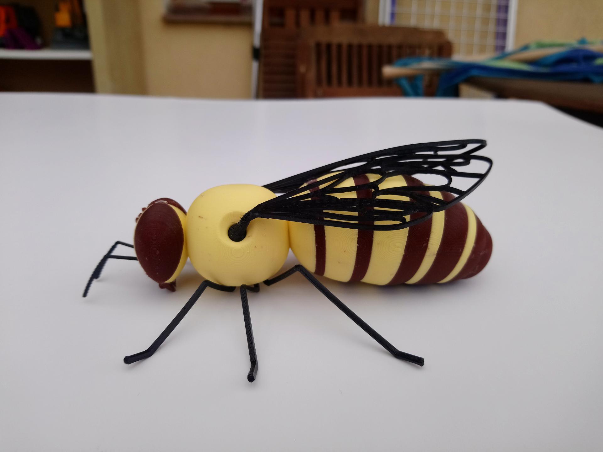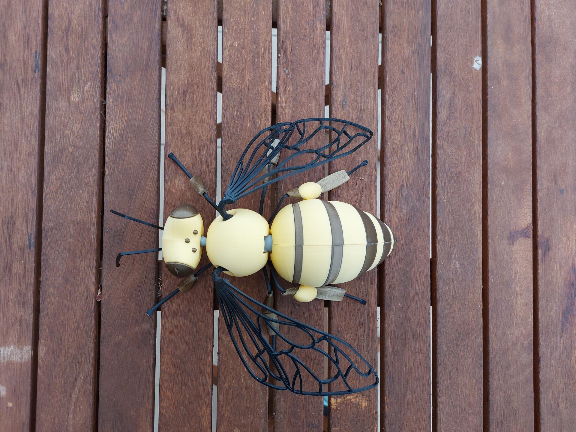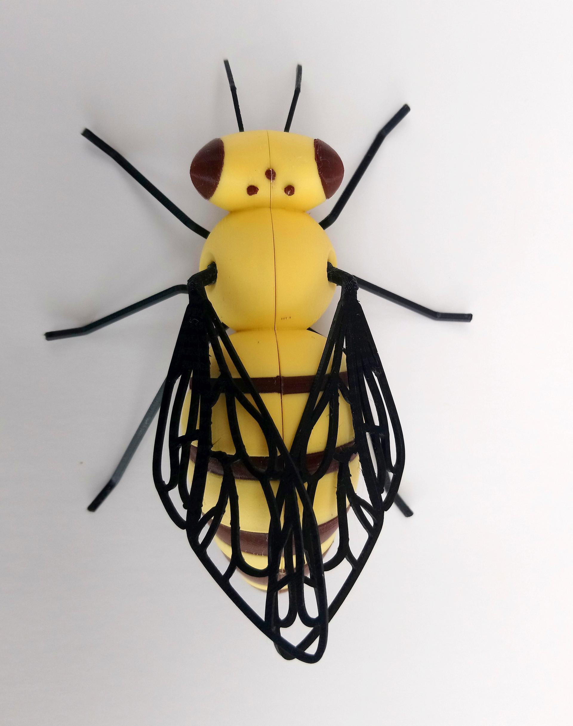 Anyagok: PLA (fej, tor, potroh, kosárka, ízek a lábakon) + TPU (szárnyak, csápok) + saválló drót zsugorcsővel és PLA elemekkel (lábak)