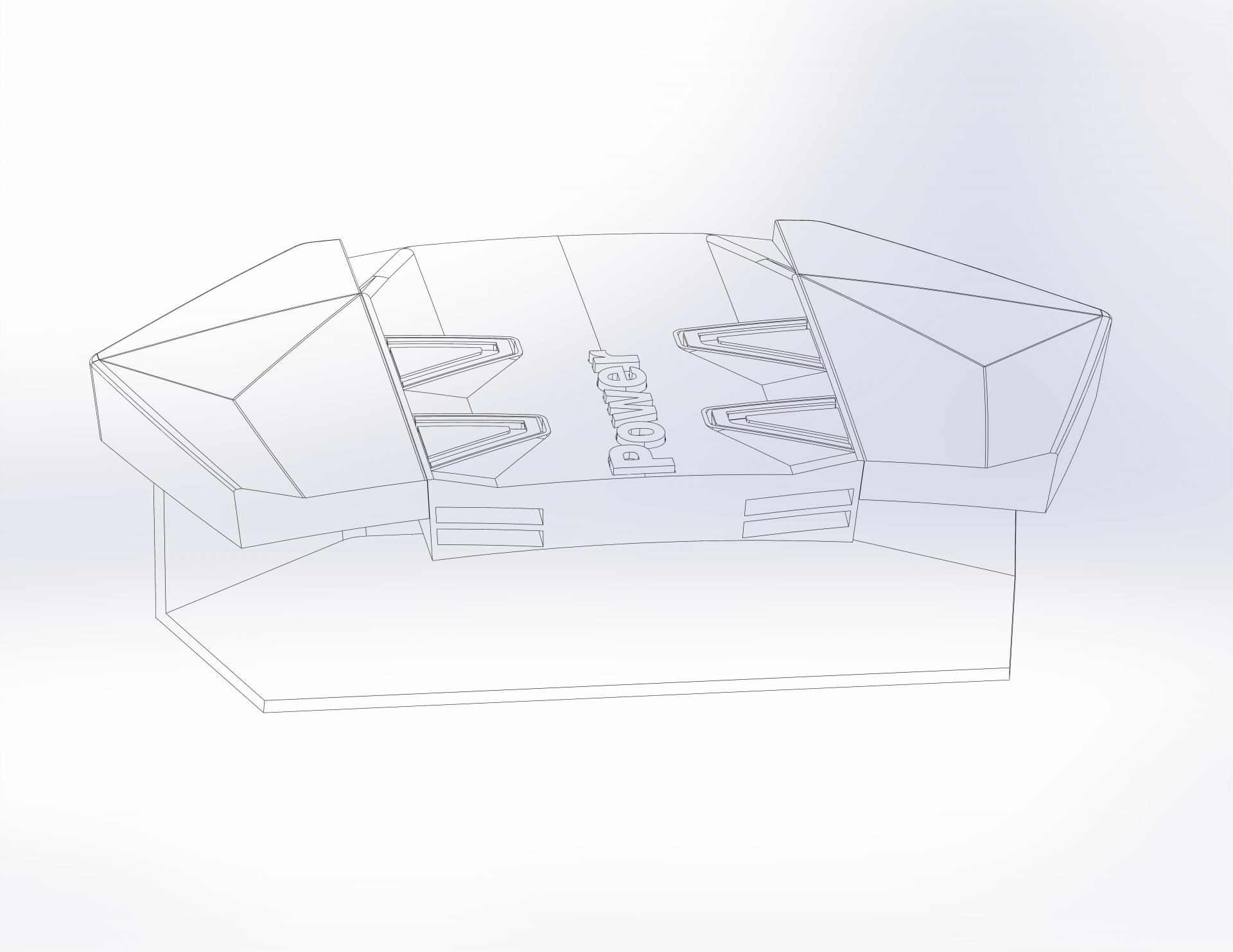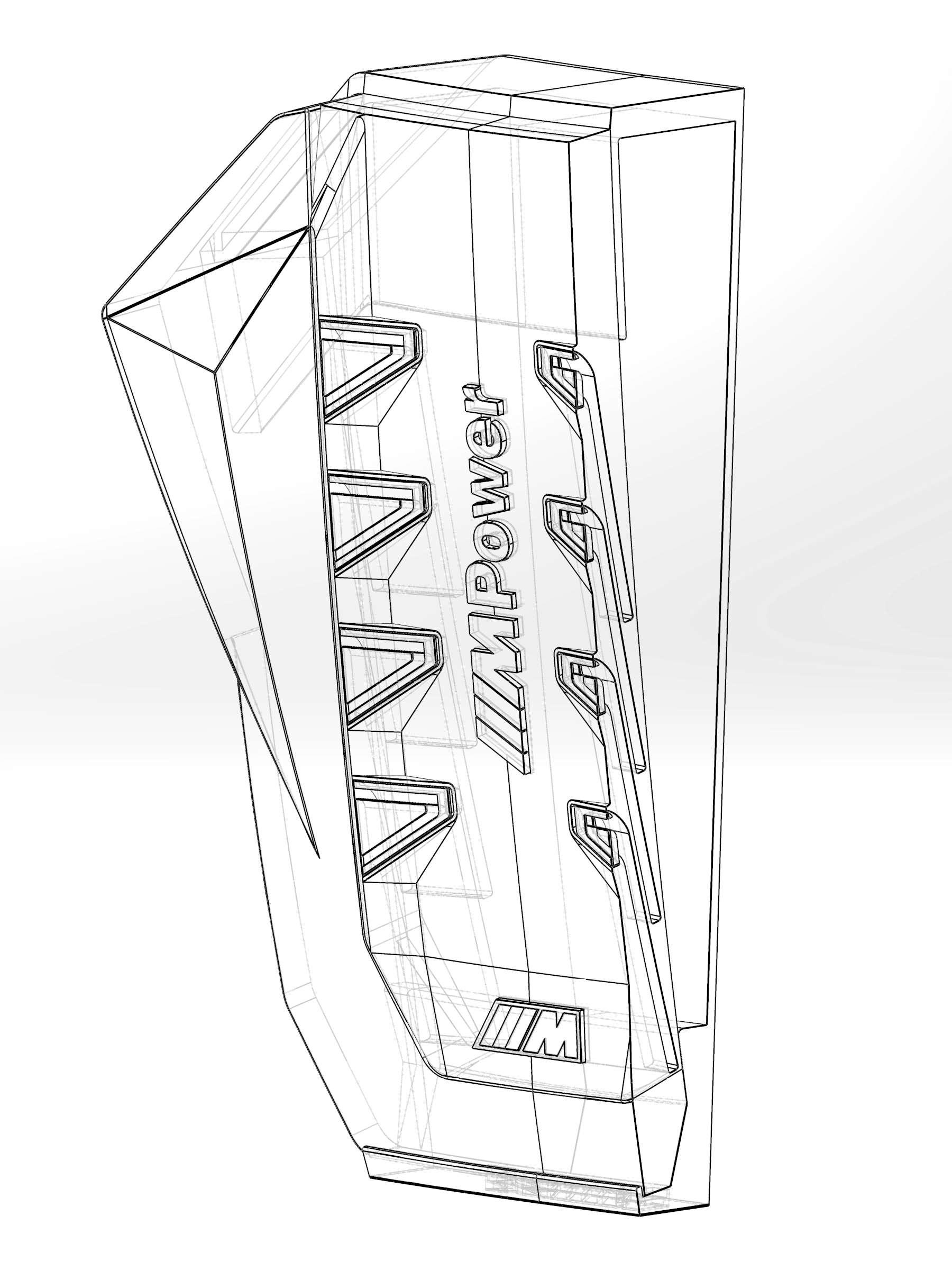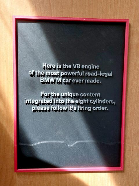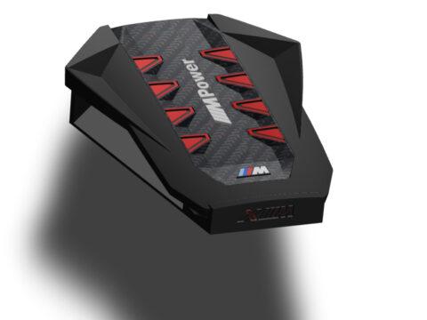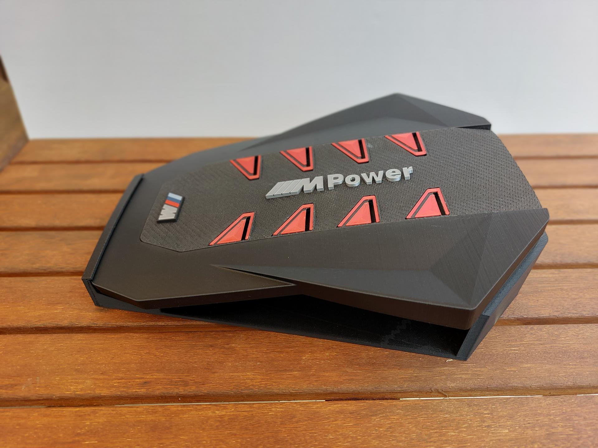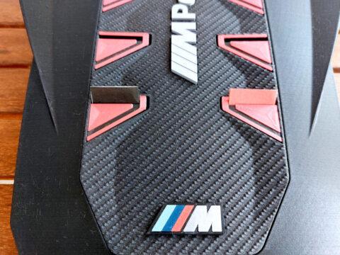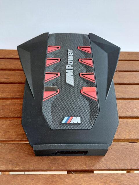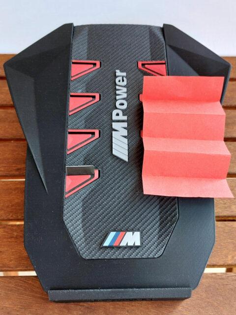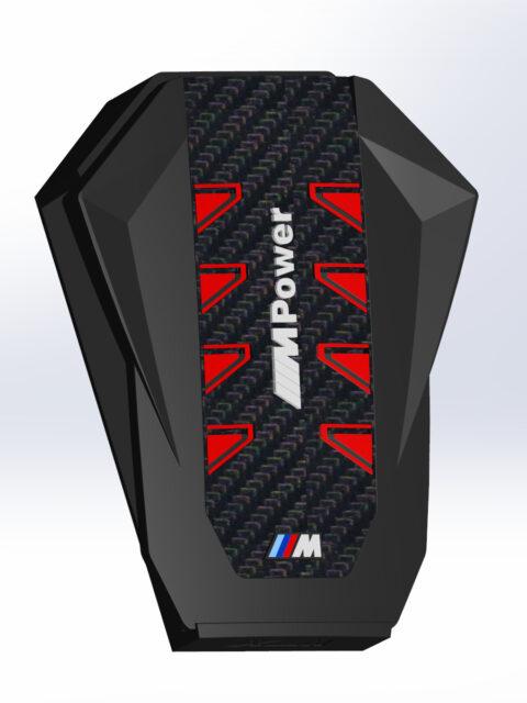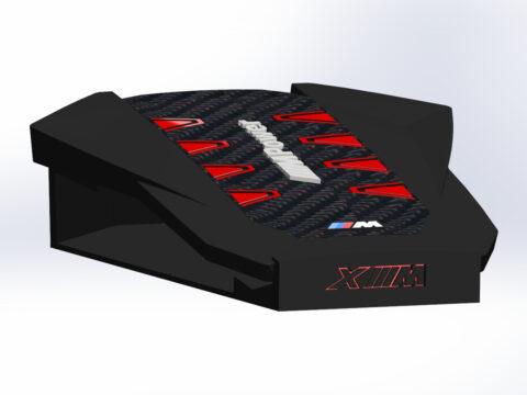 A megrendelő egy ajándéktárgy készítésének apropóján keresett meg. A BMW XM motorterében egy teljesen új megjelenésű, szénszálból és műanyagból készült díszítő elem takarja magát a motort. A hengereket négy-négy piros trapéz jelöli; ezeket kellett úgy átalakítani, hogy egy-egy személyes levelet összehajtogatva mögéjük lehessen rejteni. A motorfedelet az első sajtófotók alapján rekonstruáltam, 3D nyomtatásra alkalmas kivitelben, nyolc egymástól független, zárt zsebbel és egy önálló állvánnyal, amely megfelelő szögben döntve tartja a tárgyat.
