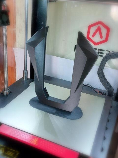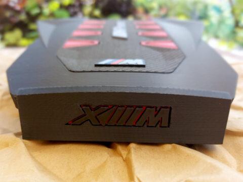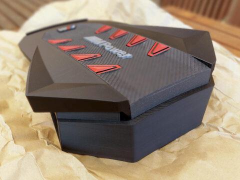 A formai hűségen felül fontos volt az anyagválasztás: nagy gonddal lett kiválasztva az összes szín és textúra, hogy minél jobban emlékeztessen az eredetire, és természetesen exkluzív megjelenést nyújtson. A szénszál mintázatát fonott domborulatokkal jelöltem, anyaga egy extra, csillámporos matt fekete PLA. A külső szegély matt fekete PLA, a trapézok szatén piros színben készültek. Később még terveztem a csomagoláshoz névkártyát és egyedi dobozfedelet is személyes üzenettel. Utóbbin a felület kettéosztása olyan kontúr mentén történt, ami követi az XM modell hűtőrácsának vonalát.